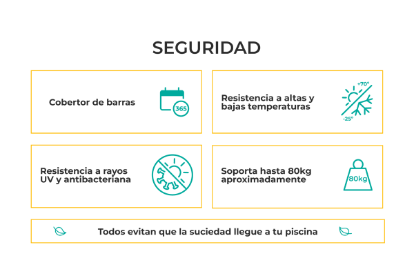 A cobertura de segurança para piscinas ACUACOBER-S Premium 10x4 (10.50 x 4.50) proporciona a segurança e a proteção de que a sua piscina necessita durante todo o ano. A cobertura de piscina 10x4 (10.50 x 4.50) é a melhor opção para tornar a sua piscina num local seguro para os mais pequenos e para os animais de estimação. Esta cobertura de segurança 10x4 (10.50 x 4.50) pode suportar até 80 kg, evitando assim quedas acidentais no interior da piscina.