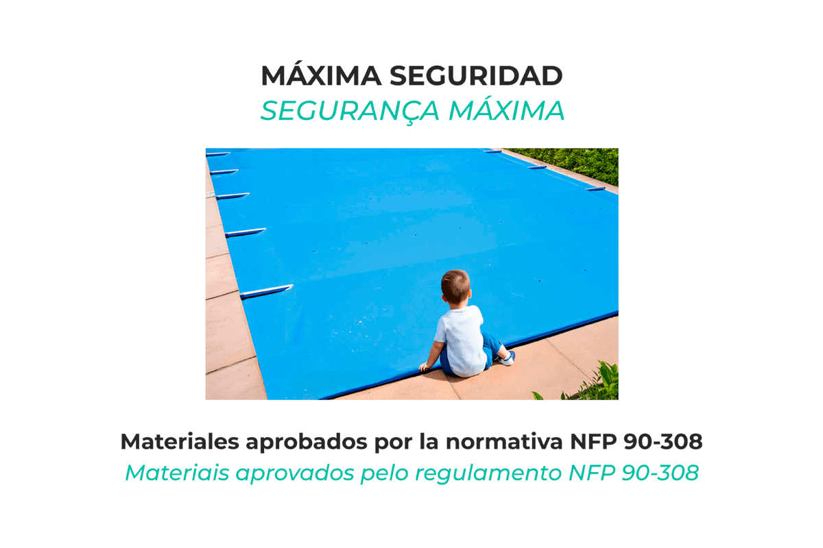 A cobertura de segurança para piscinas ACUACOBER-S Premium 8x5 (8.50 x 5.50) proporciona a segurança e a proteção de que a sua piscina necessita durante todo o ano. A cobertura de piscina 8x5 (8.50 x 5.50) é a melhor opção para tornar a sua piscina num local seguro para os mais pequenos e para os animais de estimação. Esta cobertura de segurança 8x5 (8.50 x 5.50) pode suportar até 80 kg, evitando assim quedas acidentais no interior da piscina.