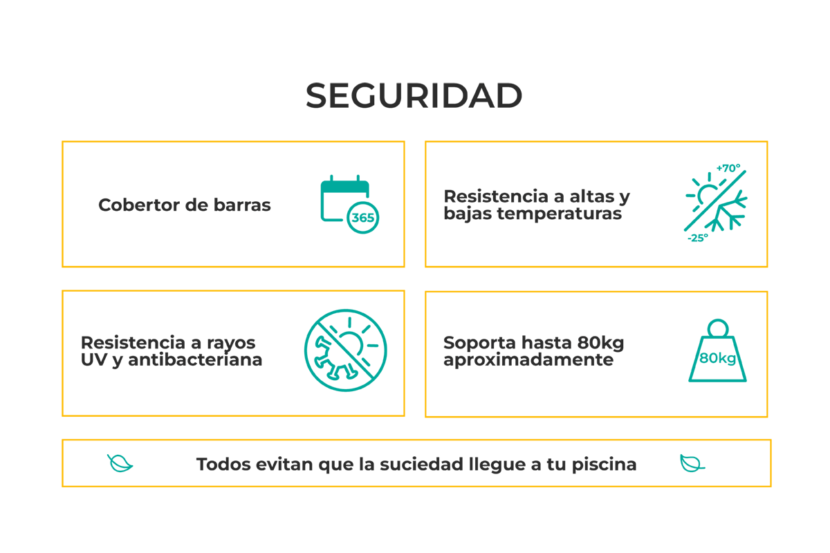 A cobertura de segurança para piscinas ACUACOBER-S Premium 9x4 (9.50 x 4.50) proporciona a segurança e a proteção de que a sua piscina necessita durante todo o ano. A cobertura de piscina 9x4 (9.50 x 4.50) é a melhor opção para tornar a sua piscina num local seguro para os mais pequenos e para os animais de estimação. Esta cobertura de segurança 9x4 (9.50 x 4.50) pode suportar até 80 kg, evitando assim quedas acidentais no interior da piscina.